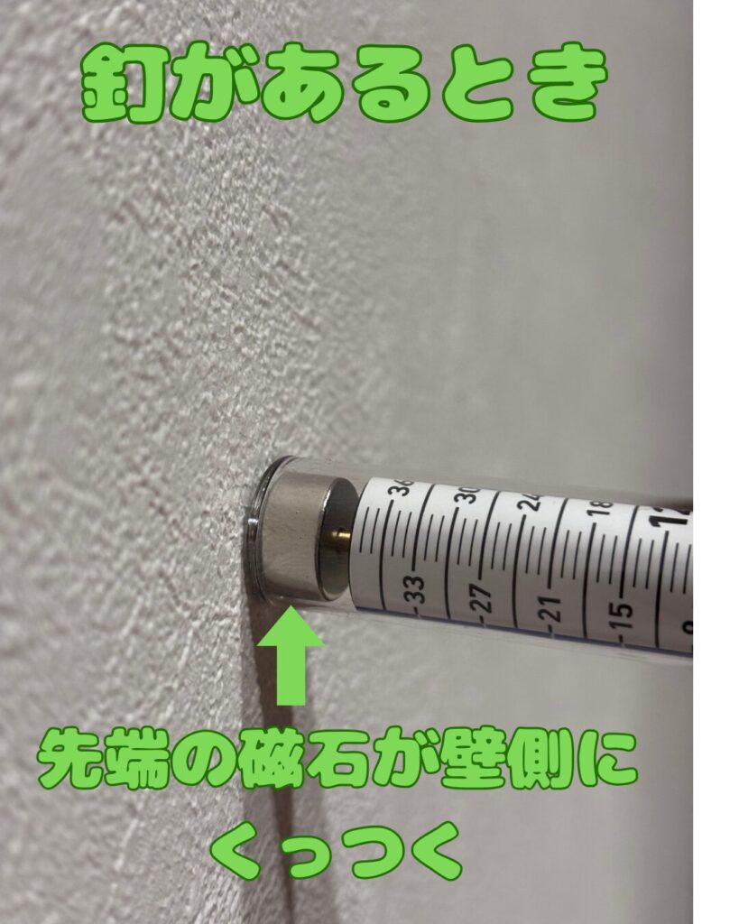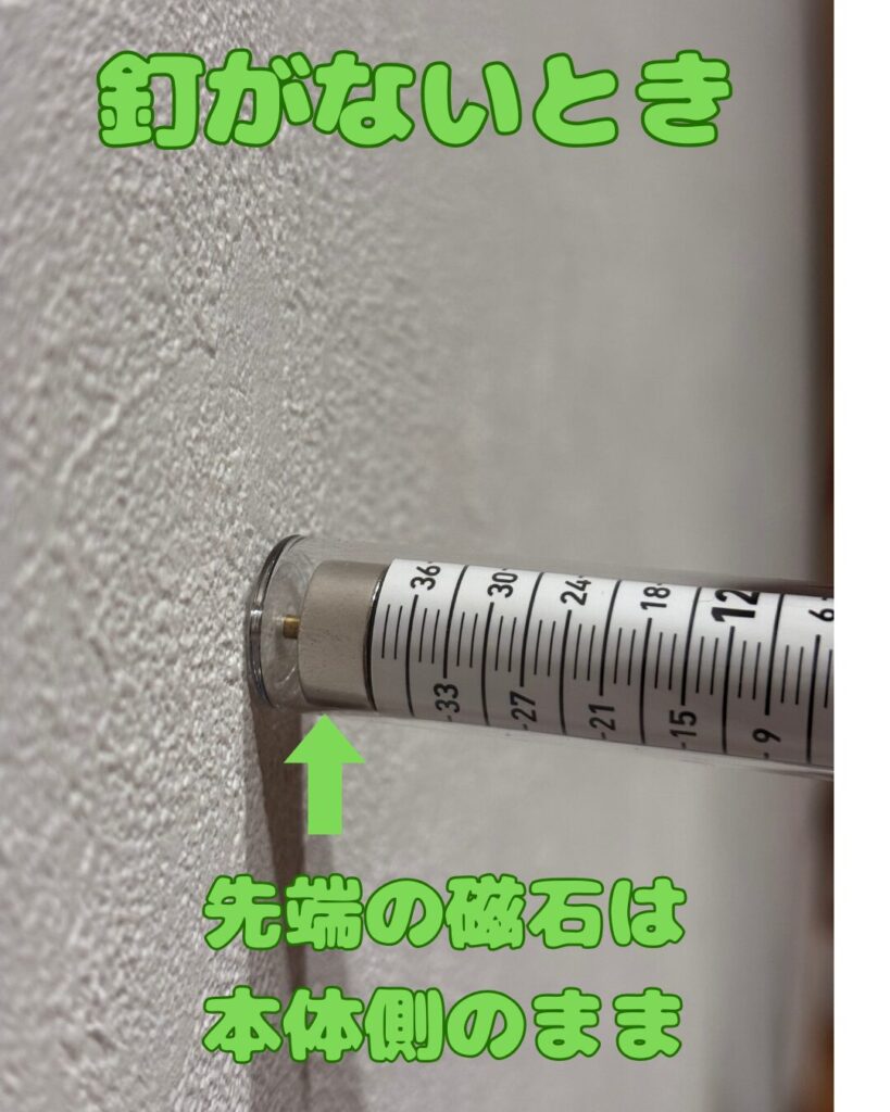 本体を壁に軽く当て、スライドさせ、先端のマグネットが壁側に張り付いたら釘がある